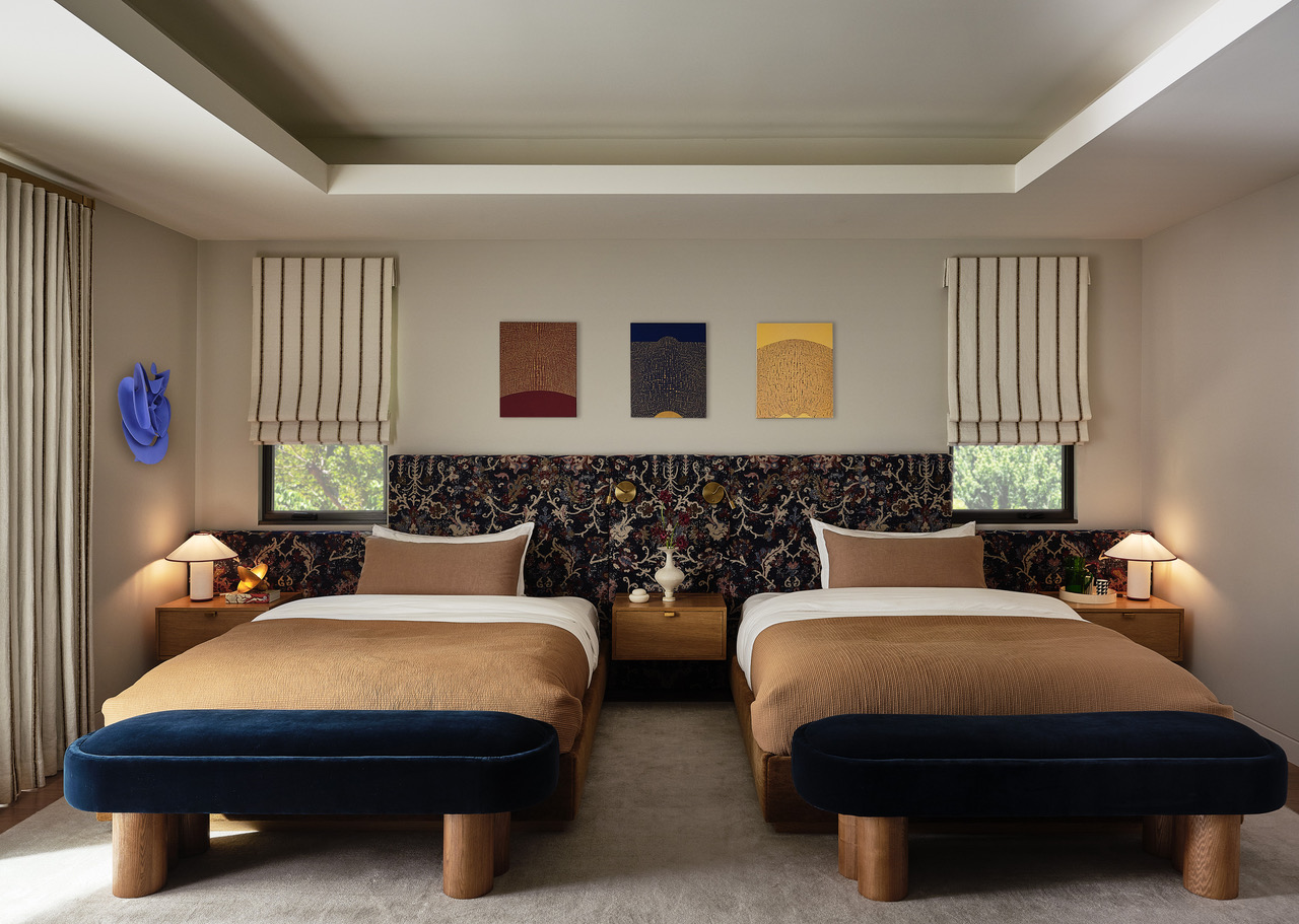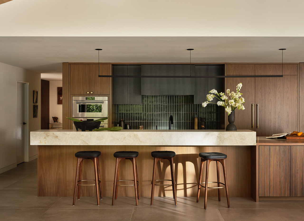 In the kitchen, it’s golden hour every hour. Custom walnut-veneer cabinetry by Precision Cabinets — paired with Emtek knobs and pulls — brings rich warmth to the space. Taj Mahal quartzite countertops, porcelain flooring, and Fireclay Tile’s Halite and Tempest Gloss backsplash reflect natural light beautifully, creating a soft, inviting glow throughout the day.