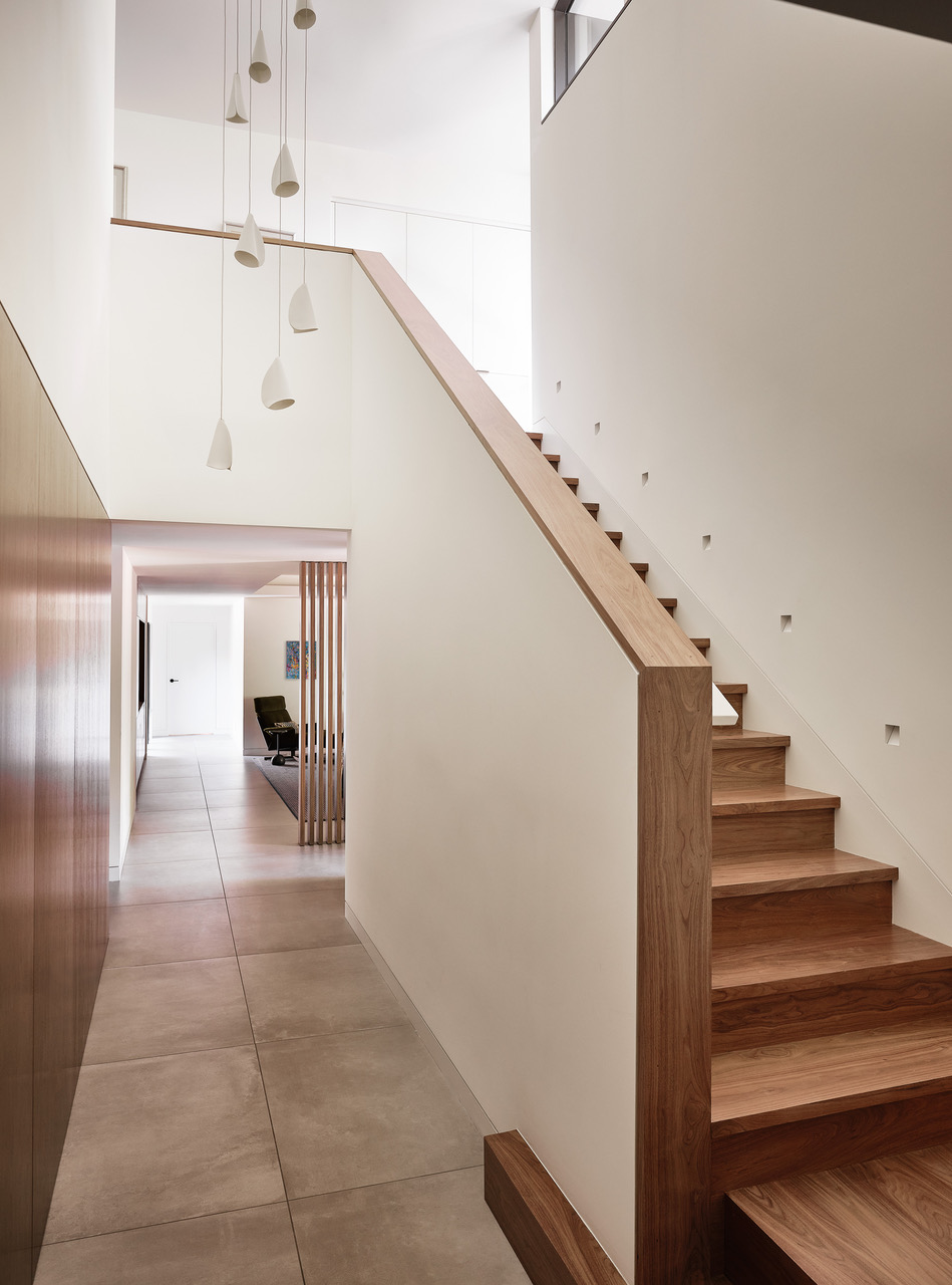The new stairway is a quiet sculptural moment in the home — a warm wooden form illuminated by Bocci’s 21.11 Random pendant. The gentle light, crisp architectural lines, and understated detailing create a calm, modern transition between the first and second floors.